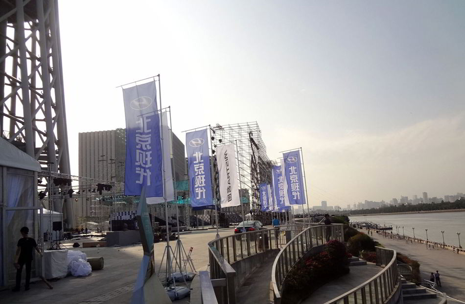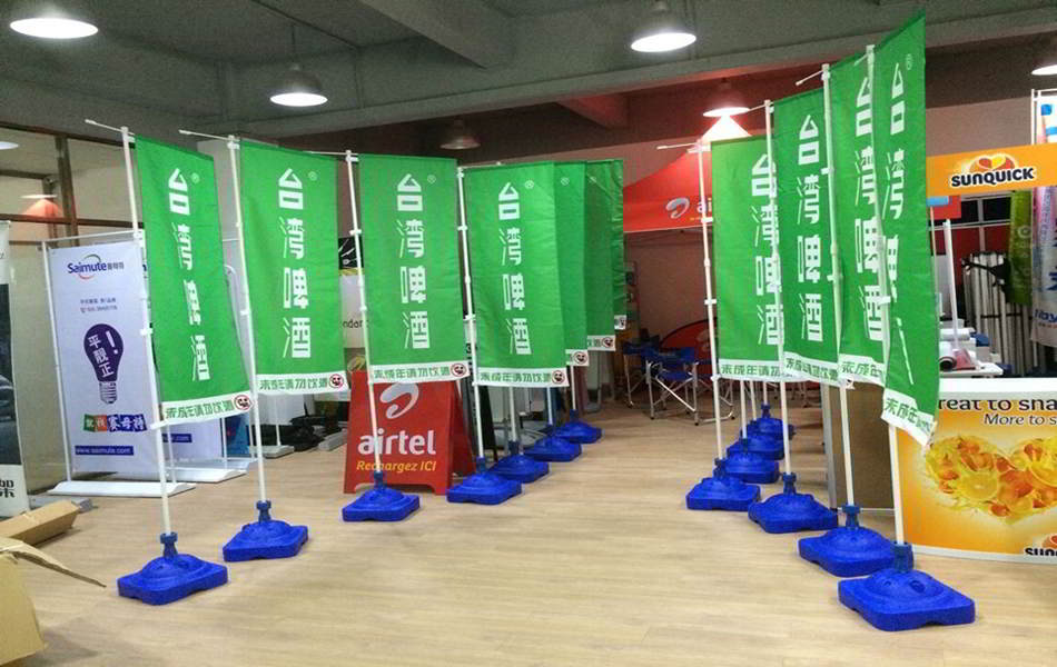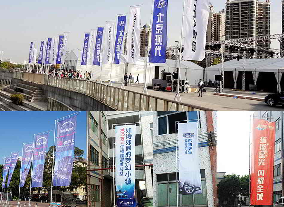 制作标准:左侧双线折边加固缝5个内置布环 ,上边缝2厘米旗筒或3个布环,其它两边为电切边防脱丝。